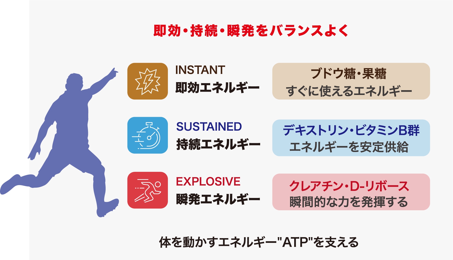 スポーツの練習中や試合時期に必要な栄養を簡単に補給、即効+持続+瞬発のエネルギー設計