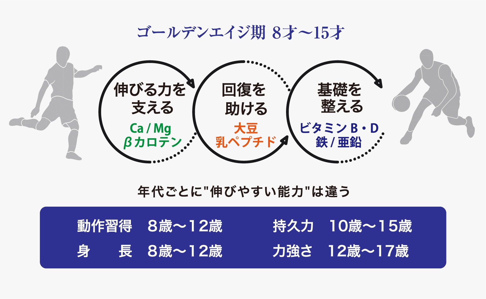 各年代でどんな能力を高め、そのために必要な栄養は何か、ゴールデンエイジに必要な「栄養」を、『ジュニアバランス』の一杯に詰め込みました。